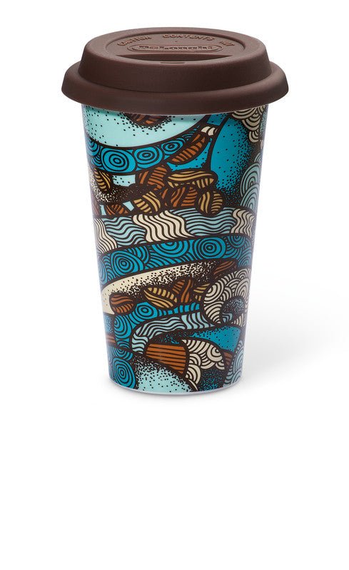 Tazza termica di ceramica a doppia parete, decorata a mano, coperchio di silicone. Lavabile in lavastoviglie e adatta al microonde.